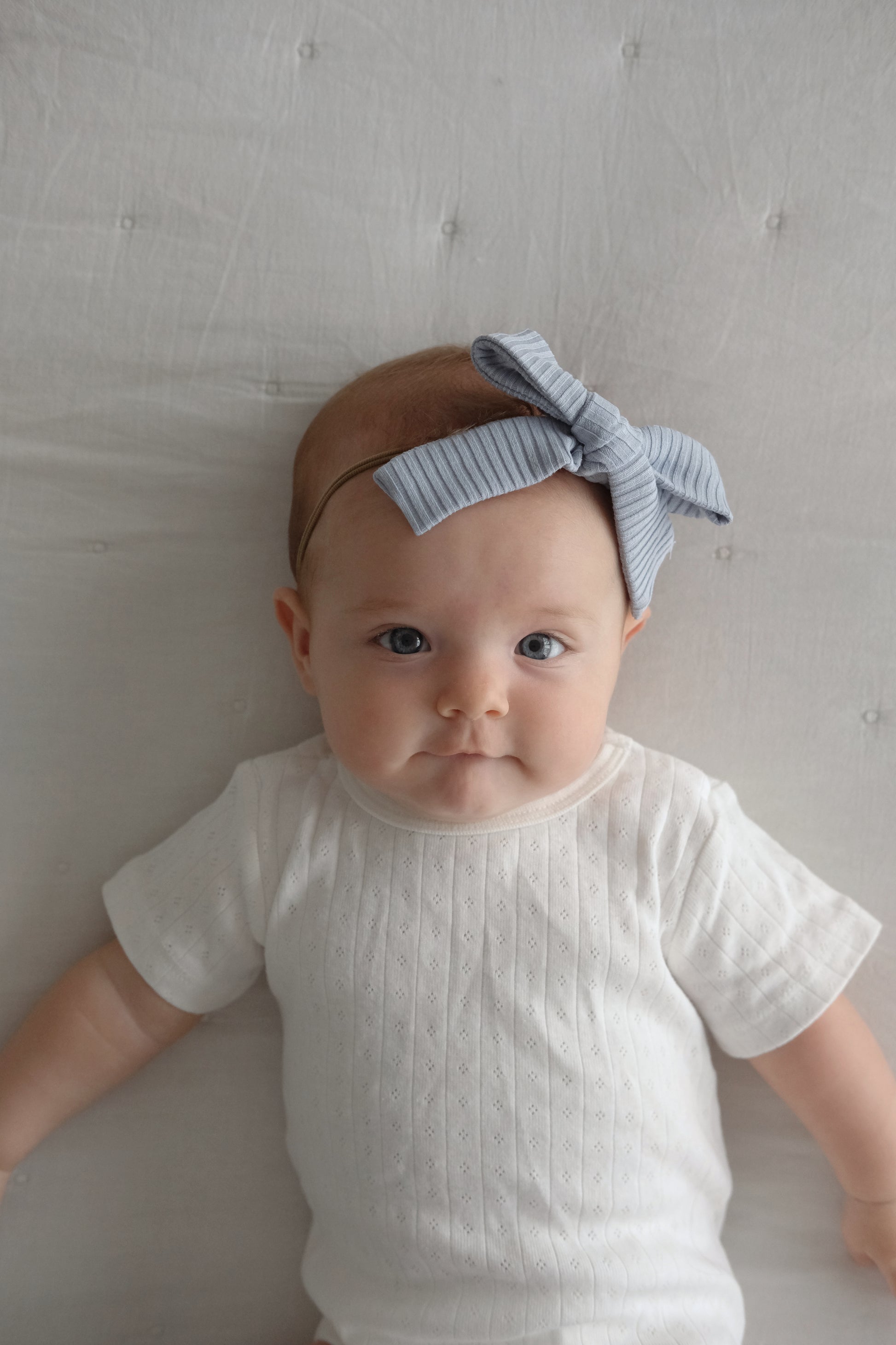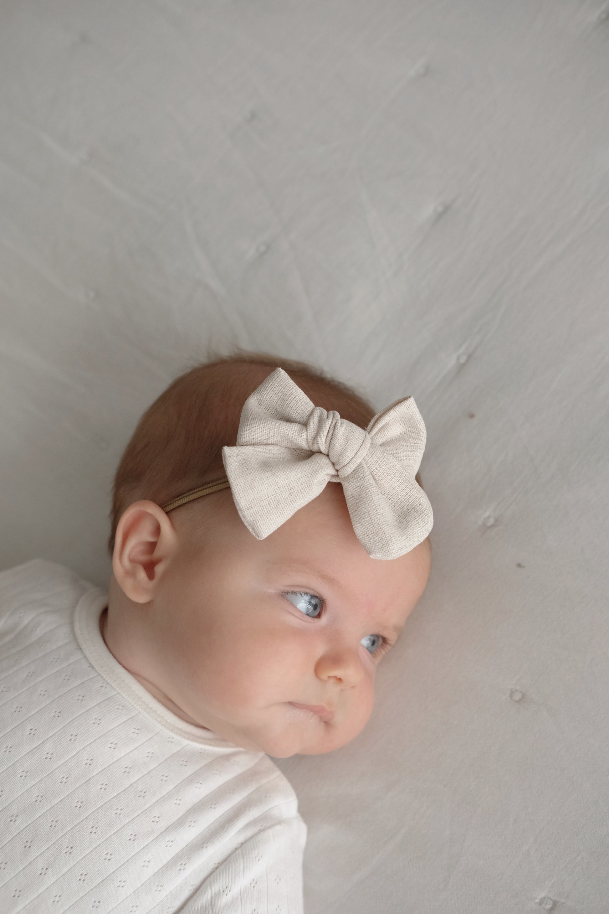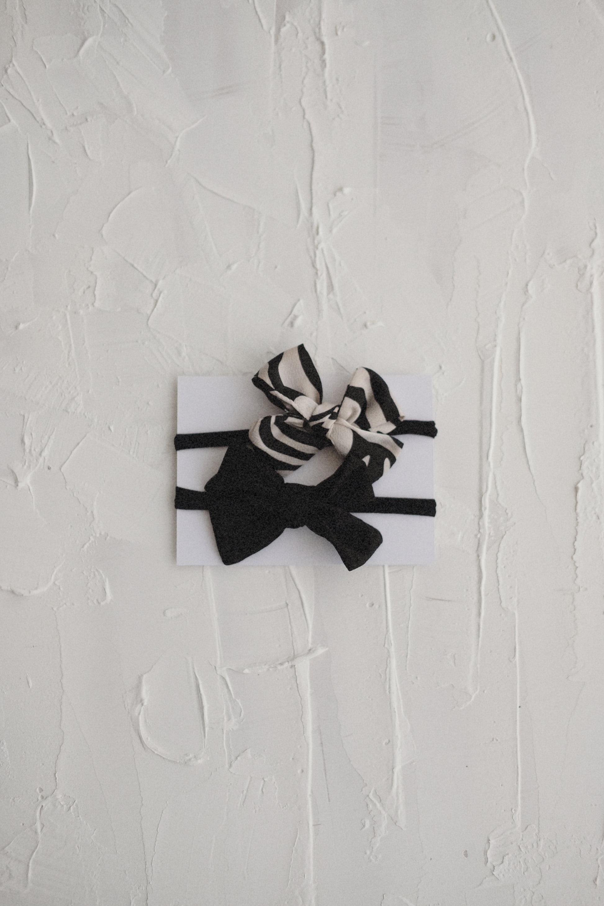 Our mini hair bows come in a pack of two and the bands are extremely soft and stretchy. They are one size fits all and stretches bigger and bigger as the head size does.