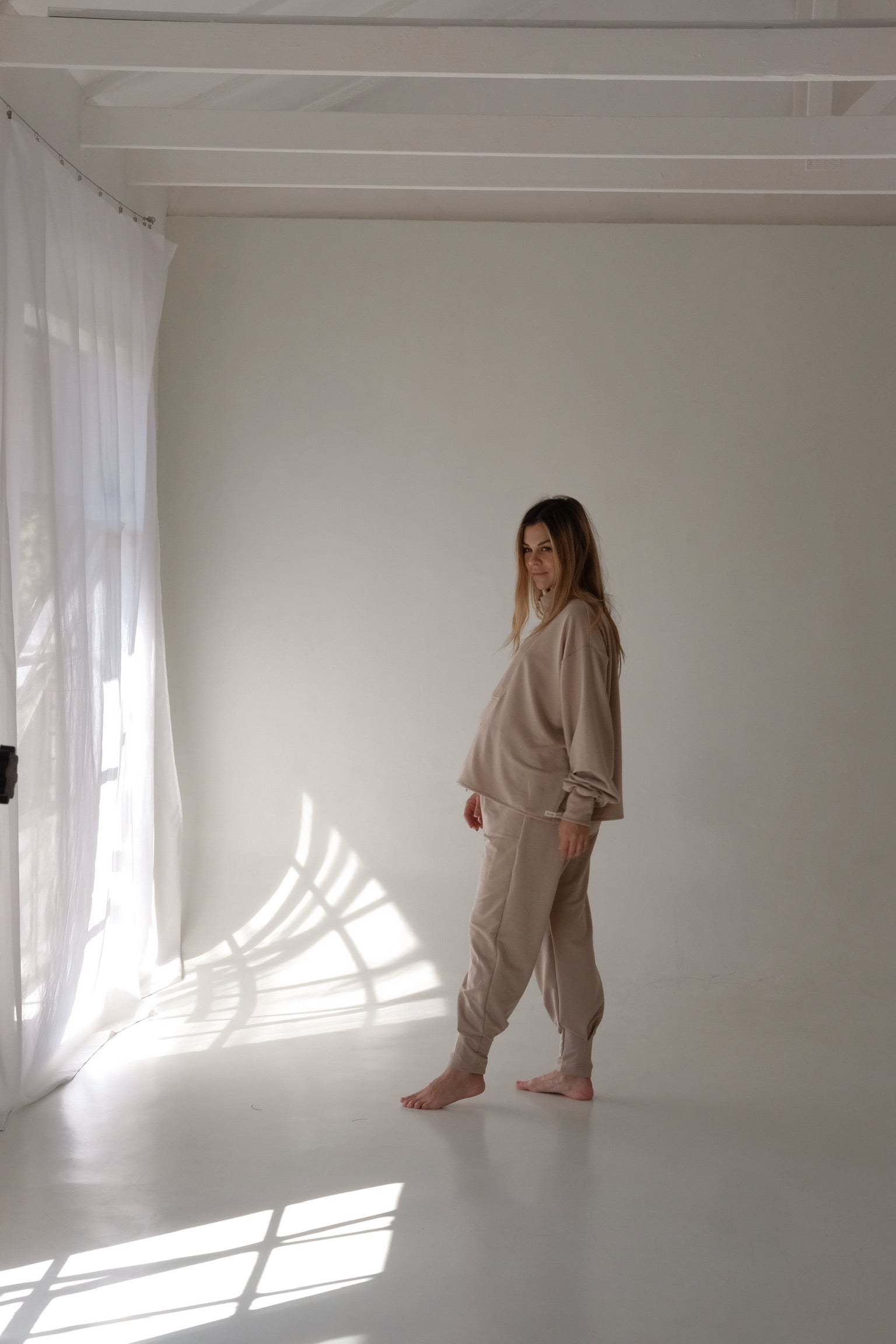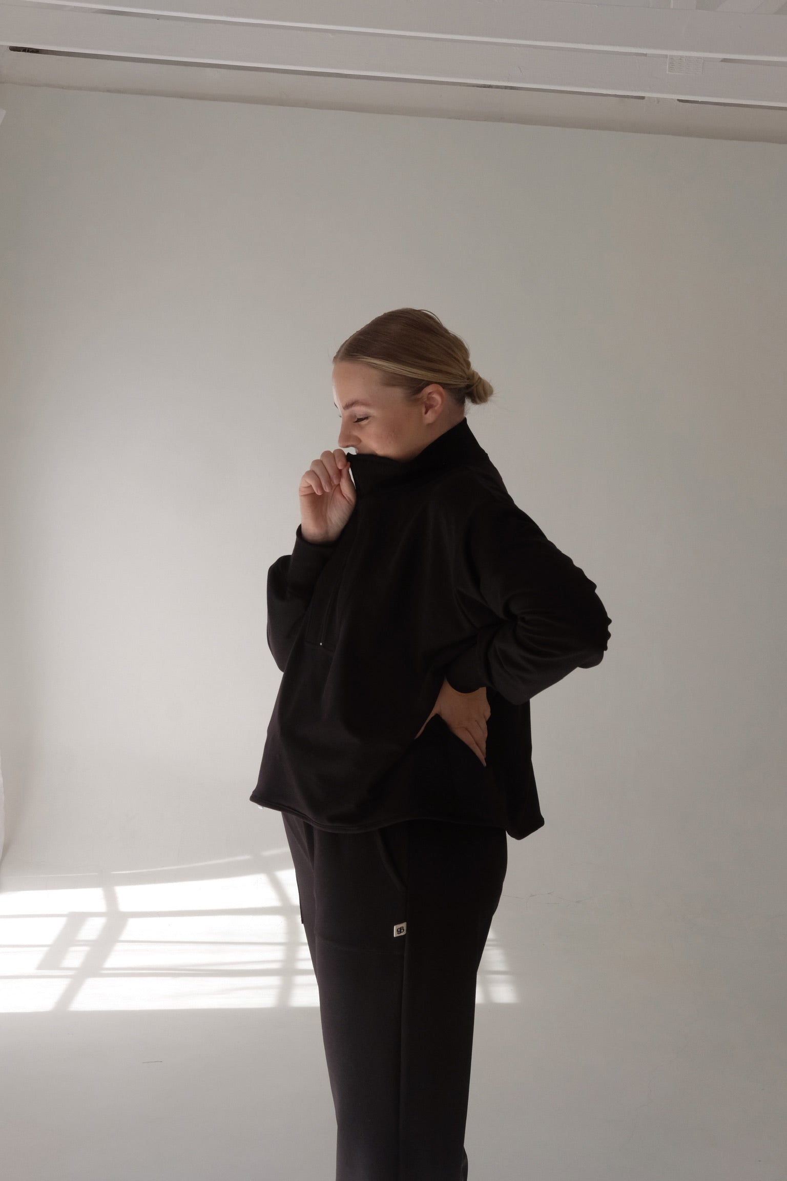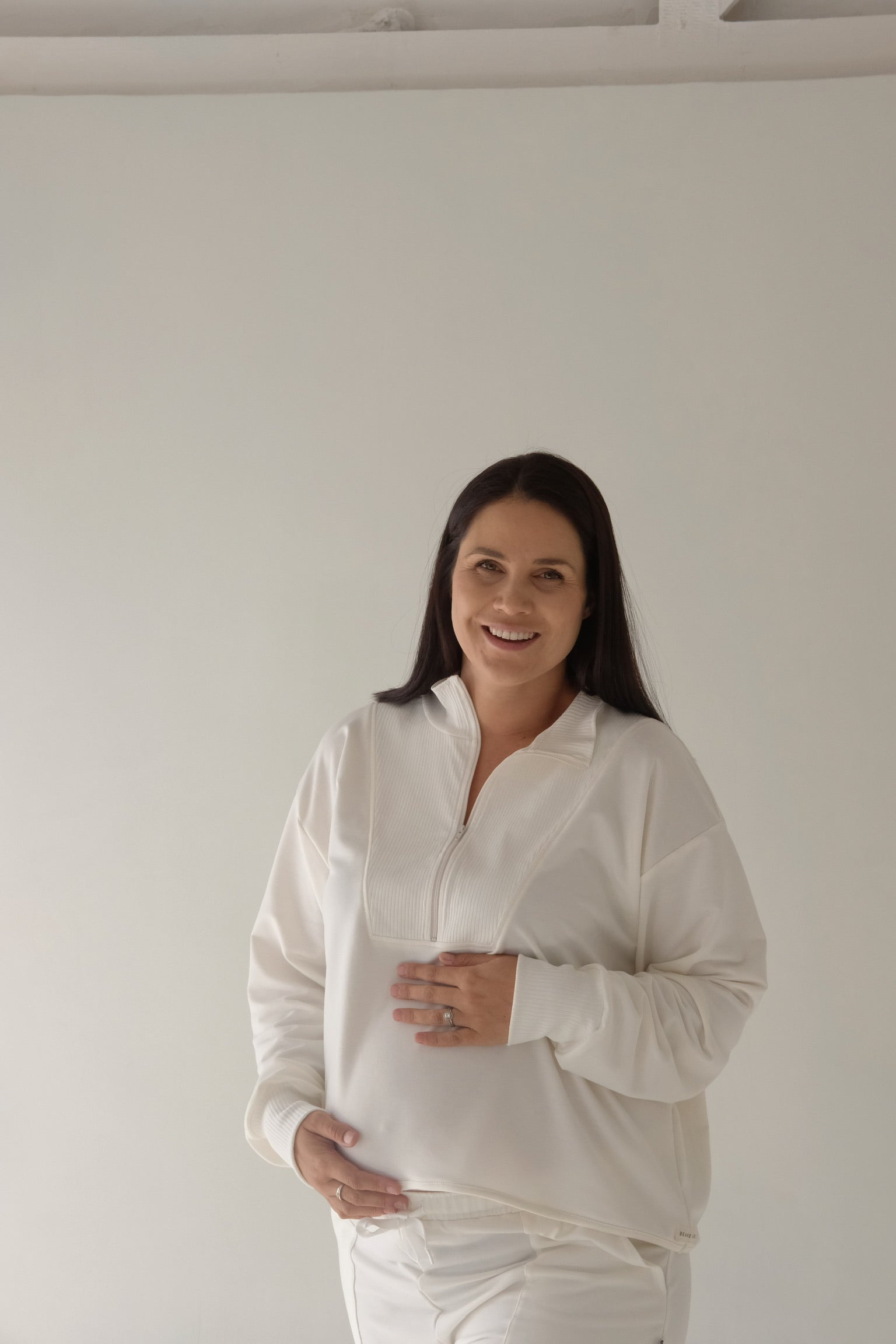 This zip-up sweater top is perfectly oversized to easily flaunt your baby bump and the zipper is strategically longer for discreet breastfeeding.