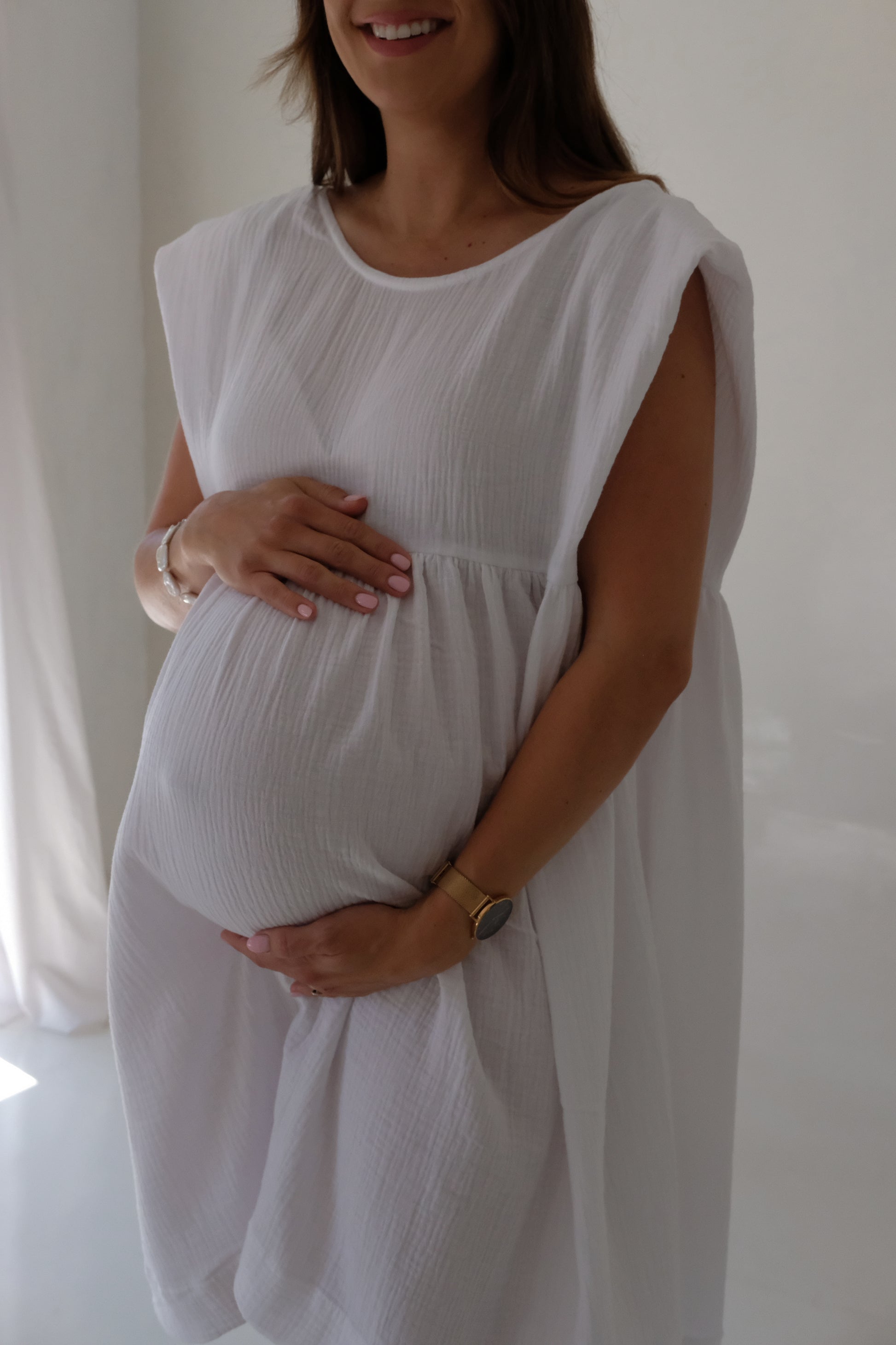 The cut and design is flat and oversized with lots of space for comfortable ease. We have designed this dress to be worn two ways and is bump and breastfeeding friendly.