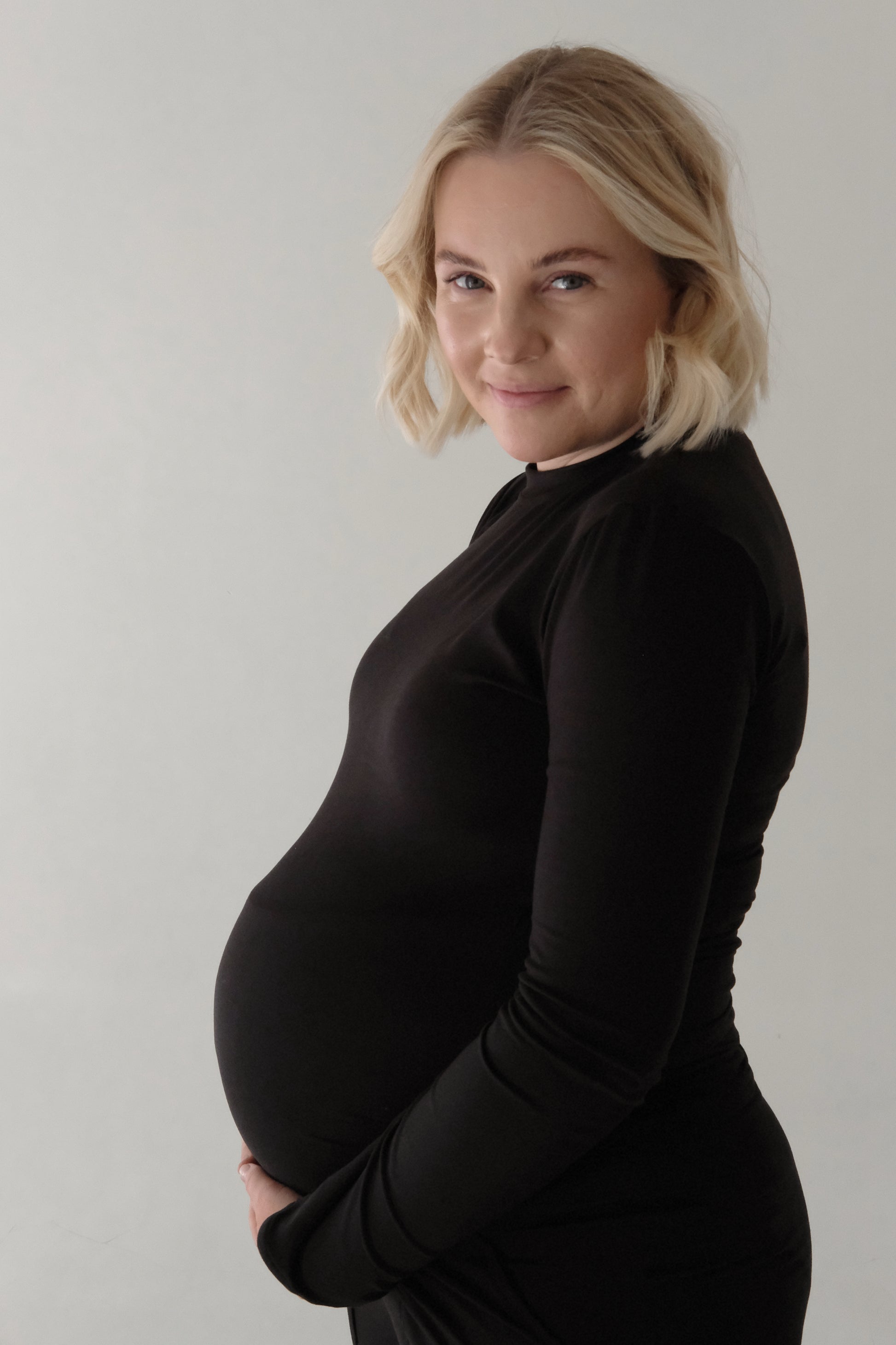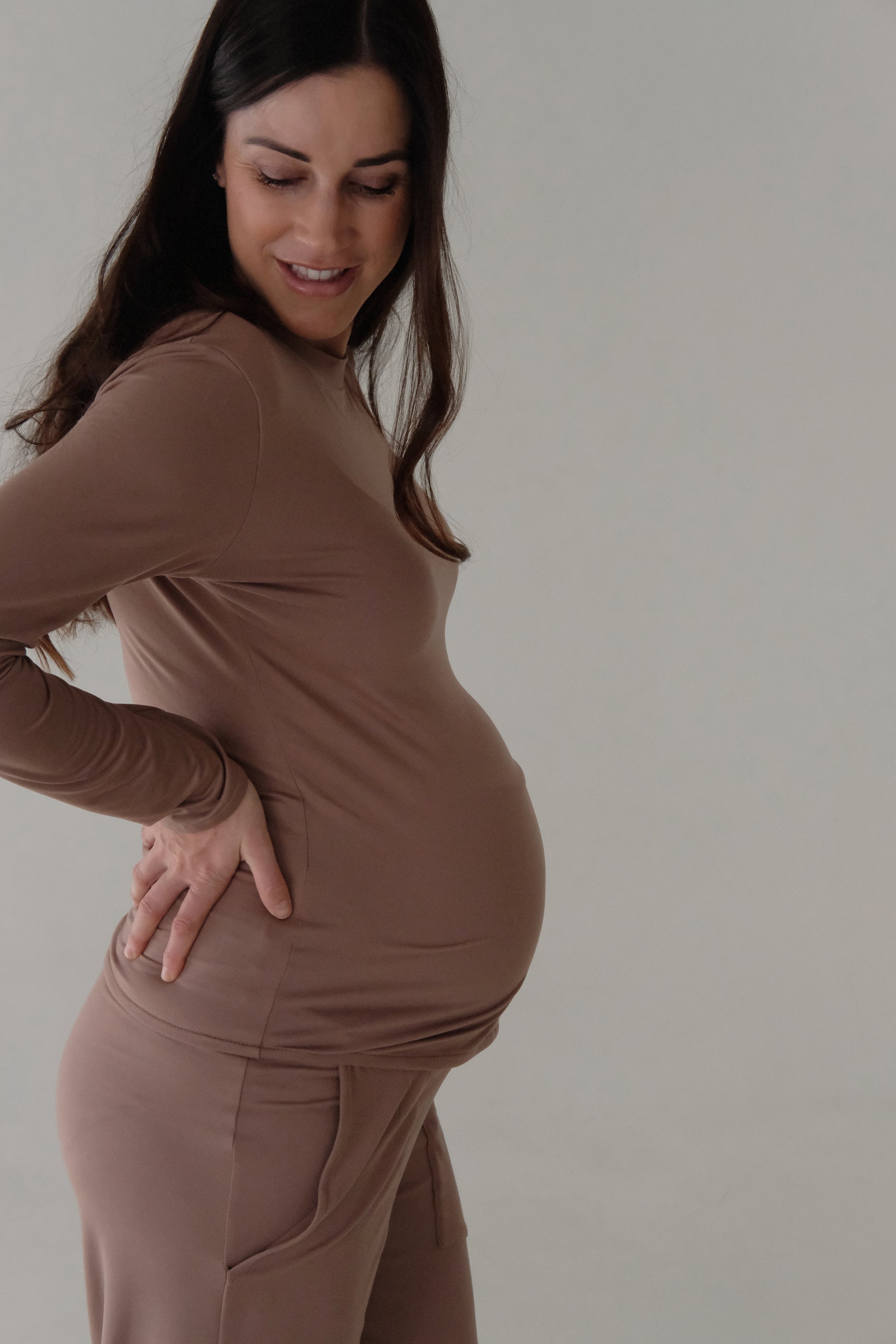 It is a regular cut long sleeve tee with a slightly longer front to easily go over a growing belly.