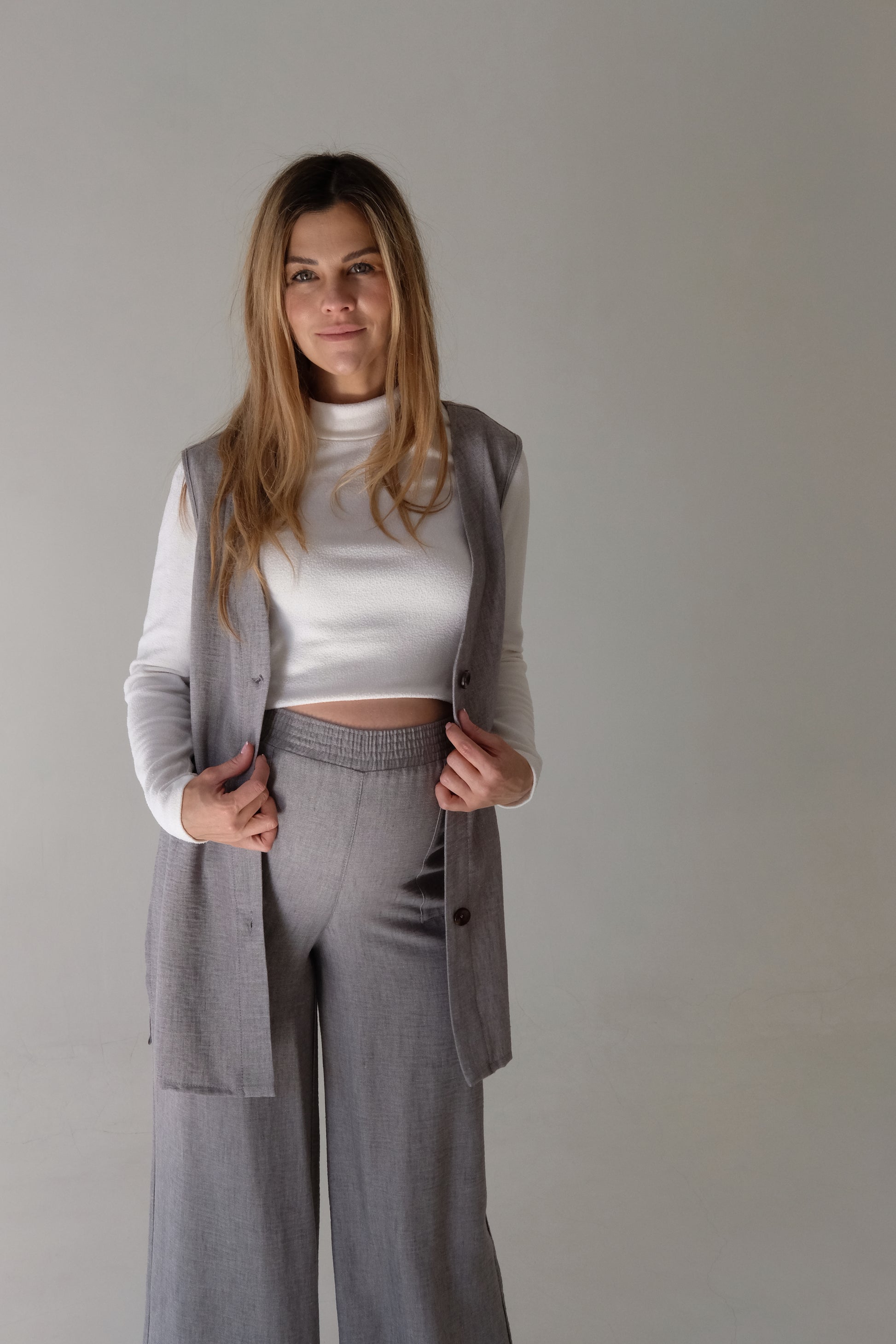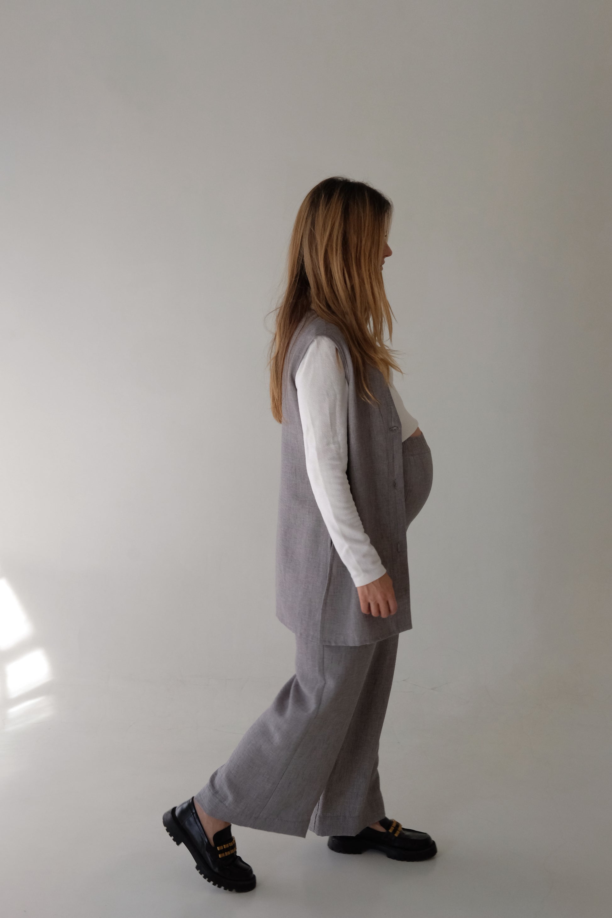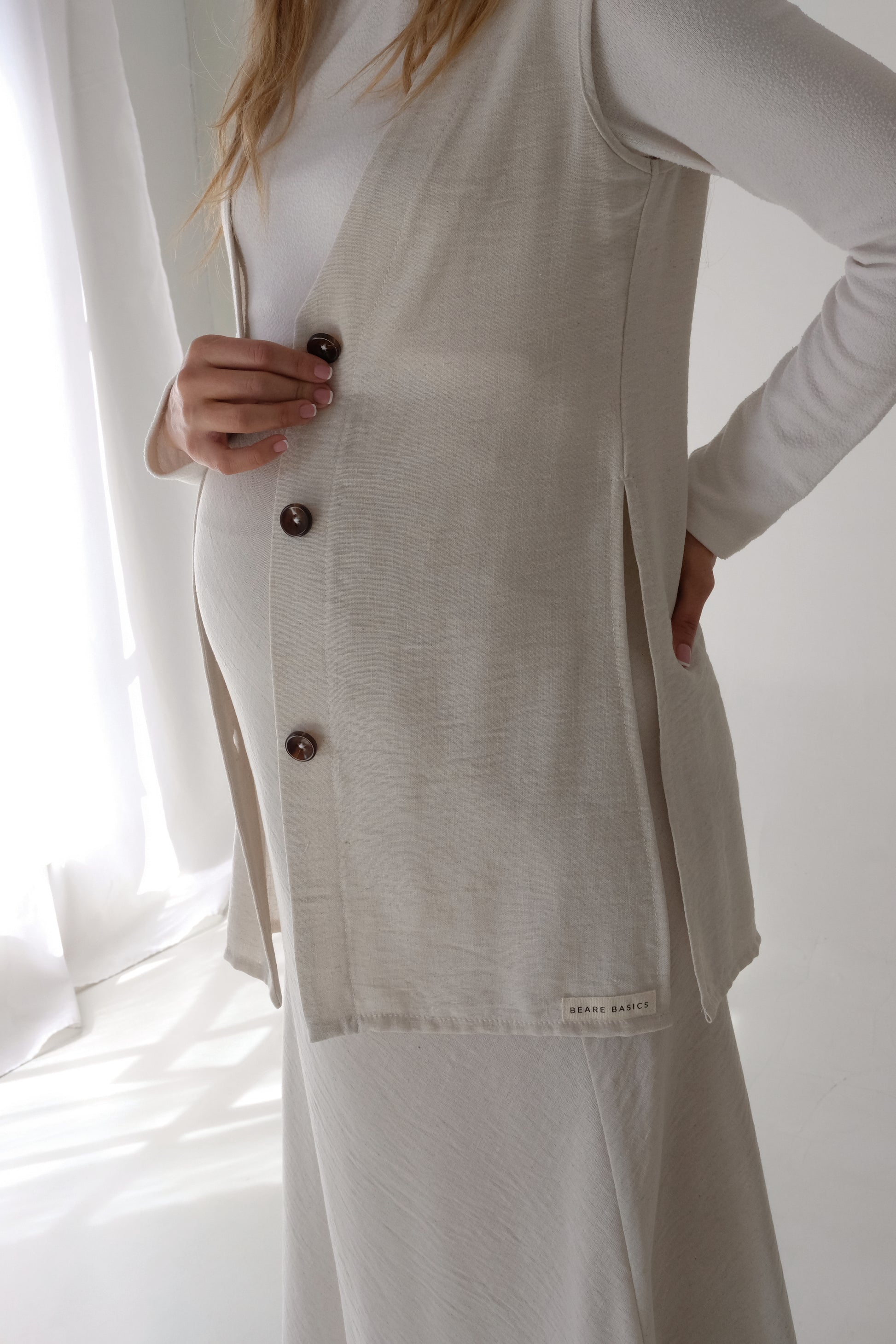 A timeless layering piece designed with effortless elegance, the Vinny Waistcoat is a versatile essential for every season. Crafted in a breathable textured fabric, it offers structure without sacrificing comfort — making it perfect for maternity styling, nursing-friendly outfits, or everyday layering. Its elongated cut and side slits create a flattering silhouette that moves with you, while the earthy neutral tones make it endlessly wearable.