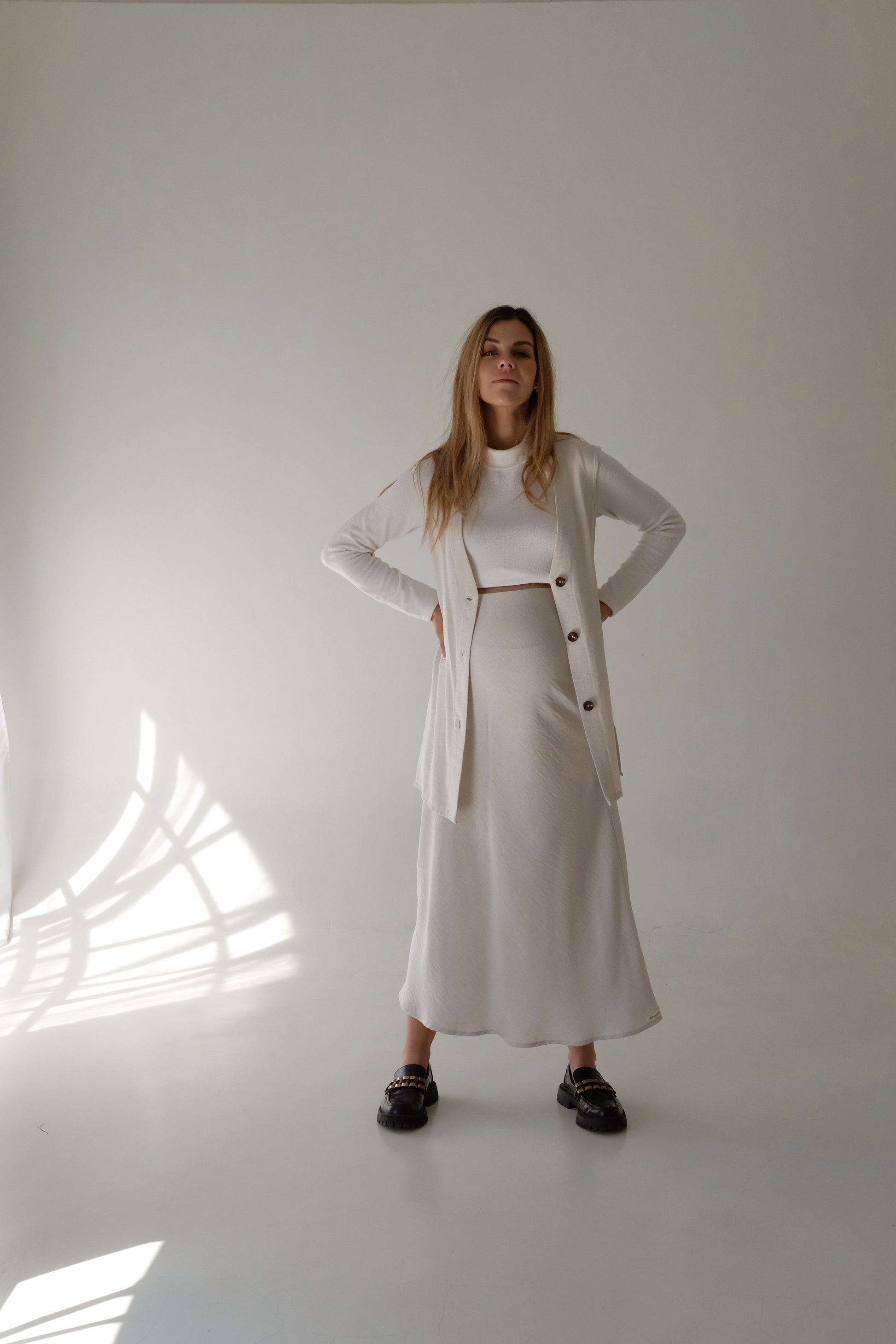 - Relaxed, elongated fit for a flattering drape over dresses, skirts, or pants